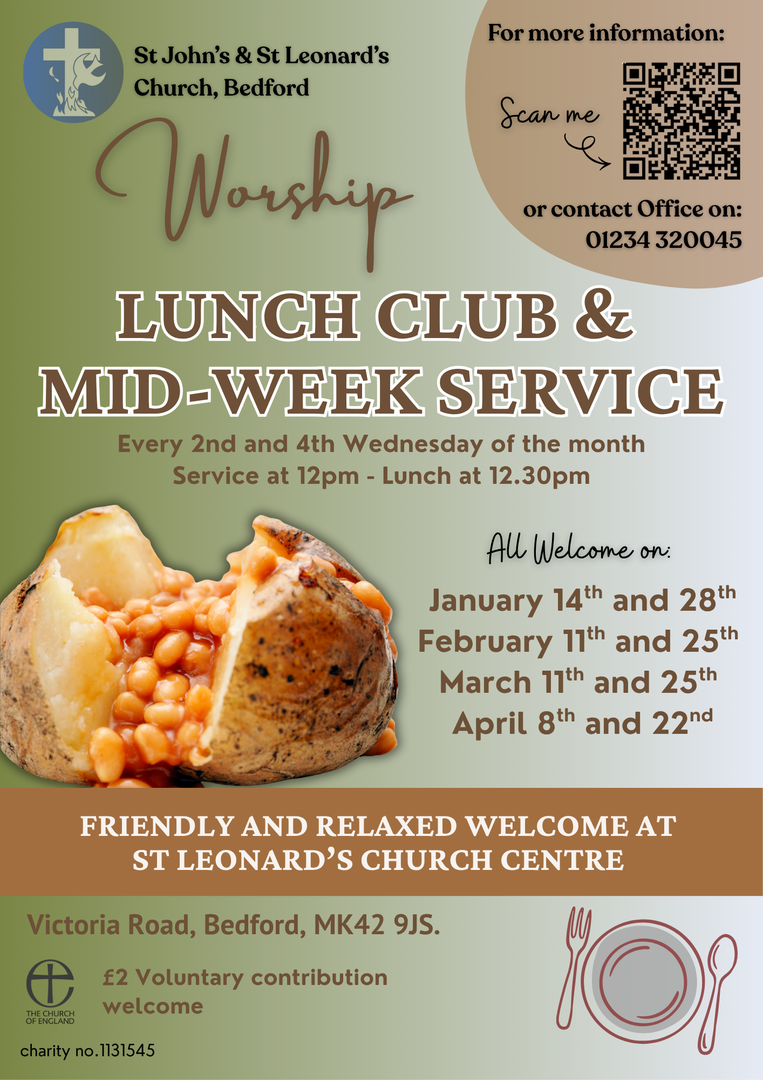 12pm to 1pm - Lunch Club & Mid-Week Service at St Leonard's Centre (2nd & 4th week of the month - see poster below)