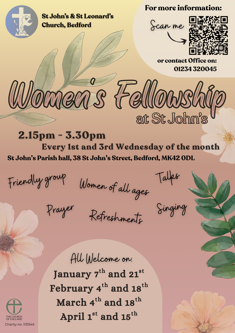 2.15pm to 3.30pm - Women's Fellowship at St John's Hall (1st and 3rd week of the month - see poster below)