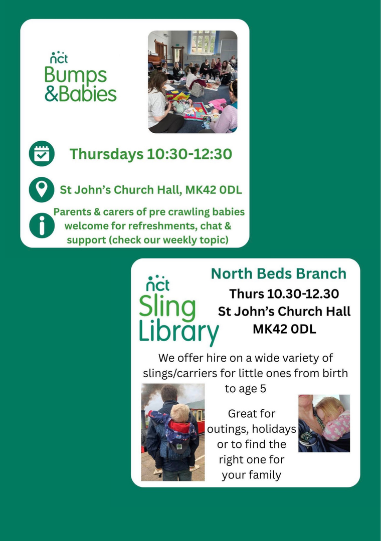 10.30am to 12.30pm - Bumps and Babes & Sling Library (NCT group) in St Johns hall (every week).