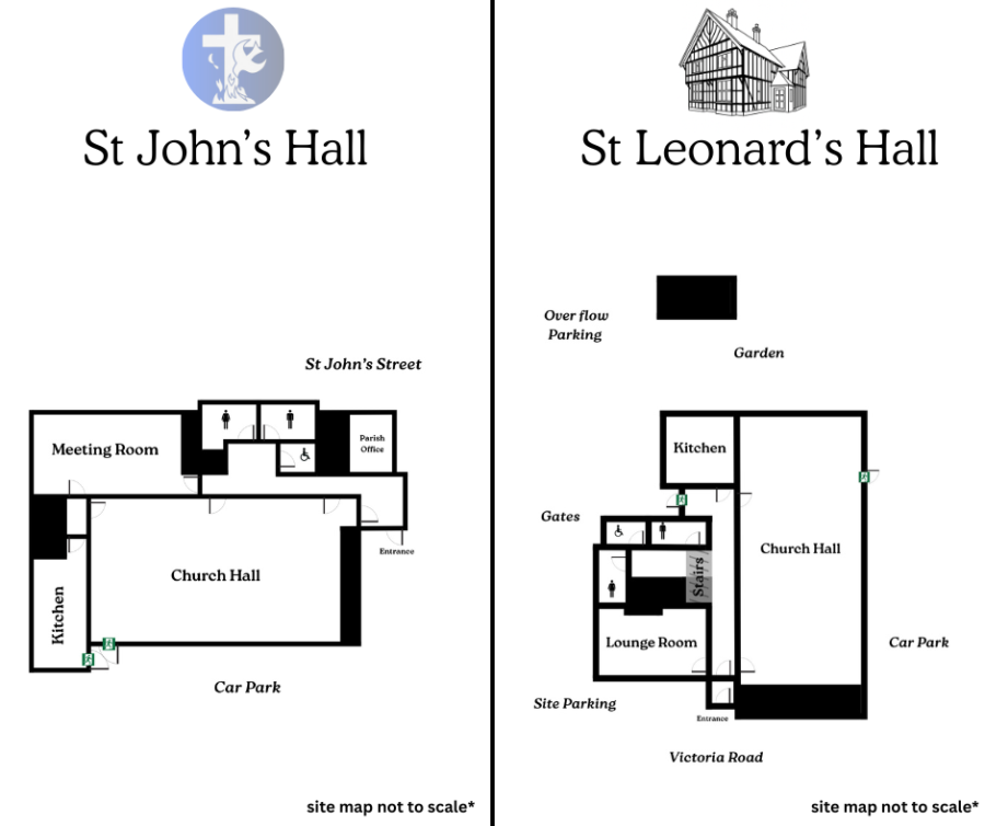 St Johns Church: One Large Hall, Kitchen with serving counter, WC (Disabled & Baby Changing), Car Park & Small Meeting Room.