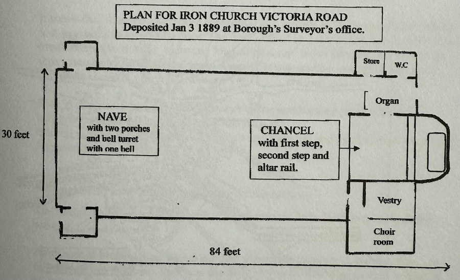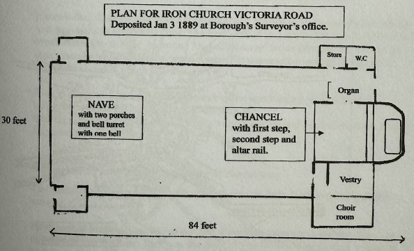No photo or sketch has survived of this temporary building but the original plan for 'St. Leonard's Iron church' was submitted to the Borough Surveyor in January 1889 and preserved in the Bedfordshire Records Office.