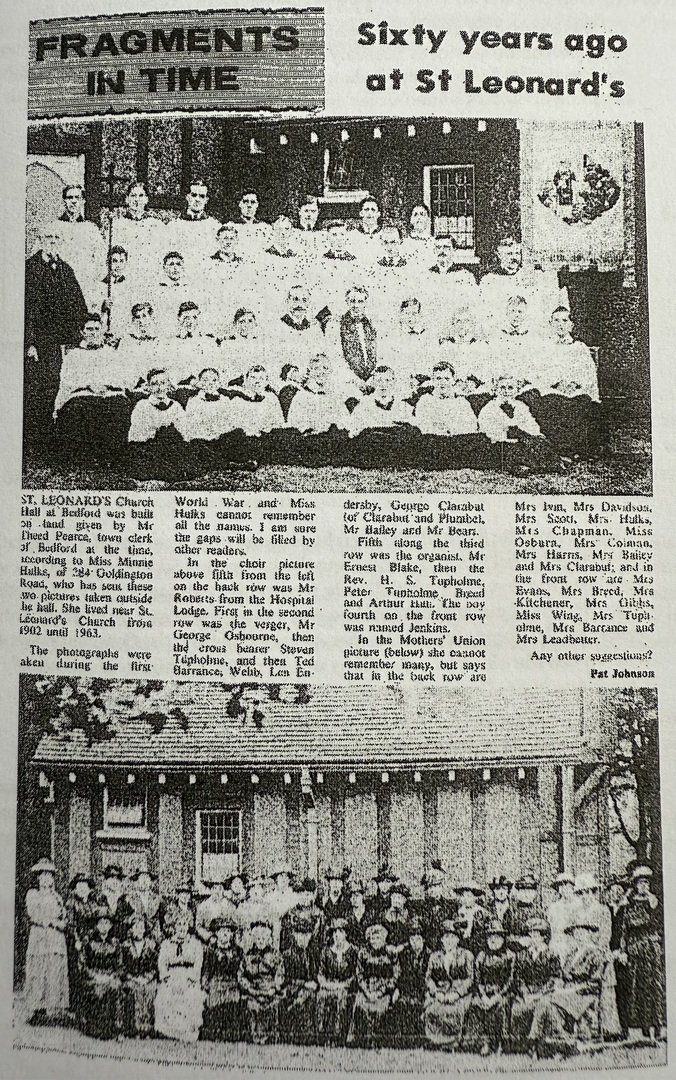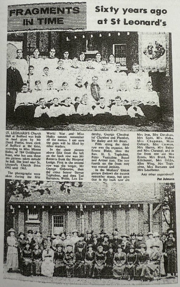 The first service was held in St. Leonard's 'tin tabernacle' on June 28th 1889. There were already similar buildings on the new areas of Christchurch and St. Andrews in north Bedford. It was erected on land given by Mr. Theed Pearse next to 6 Victoria Road, now occupied by Hadfield Court flats.