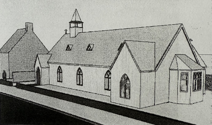 The original plans for the 1912 church were very ambitious. It would have been 135 feet long and 62 feet wide and with seating for 824 people! This drawing from a local newspaper shows the original design. By the time it came to be built, some 18 years later, the plans had been scaled back to two-thirds of the length and the remainder was never built.