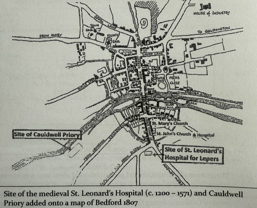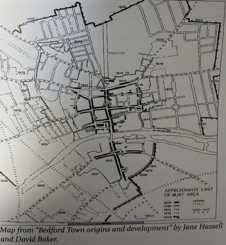 Until the mid-1800's the town effectively ended at the end of St. John's Street marked by the prominent King's Ditch. The following map shows that outside the King's Dyke (or Ditch) was the medieval St. Leonard's Hospital for Lepers, between the London Road and the present Ampthill Road (then the main route to Elstow).