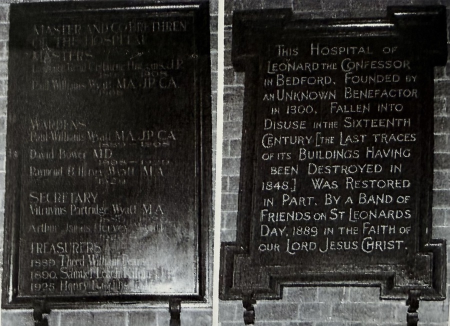 Rev. Paul Wyatt had a board erected listing the names of the former Masters of the medieval St. Leonard's Hospital from 12.. to 1571 as a reminder of his inspiration from the past. Inside the present St. Leonard's are boards (illustrated below) which give the names of the people at the helm of that charitable work, in which Paul Wyatt's name is prominent.