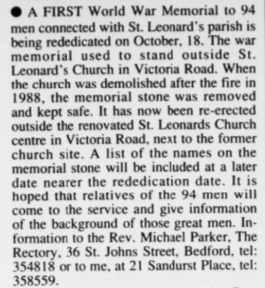 The WW1 memorial tablet still stands at St Leonard's Church Center which once stood outisde the 'New' Church, however relocated after the Church fire as stated in the article below: